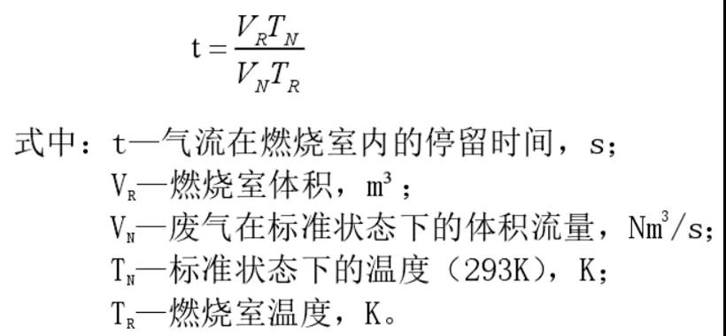 为使有机废气燃烧获得很高的处理效率,要求有机废气在燃烧室内保持一个最低的停留时间,通常是 0.3~1.0s 之间,可保证一般工况下的VOCs基本处理殆尽。理论上,若燃烧室温度越高、停留时间越长,则有机废气的处理效率越高。但若是延长停留时间以提高净化率,燃烧室容积就要随之增加。从净化效果方面考虑结合实际操作,建议有机废气的滞留时间一般不小于 0.75s,当然,有机化工的涉VOCs废气在RTO的停留时间需要设计更长一些。有机废气燃烧室内驻留时间可按公式如下得出: