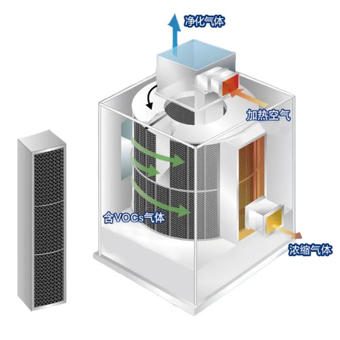 筒式沸石转轮来自日本东洋纺,除了材料加工上的差异,从结构上和盘式有很大的区别,利用模块化沸石材料填充成筒状结构,来实现VOCs的吸附浓缩。