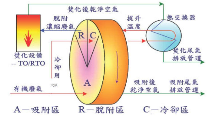 吸附于浓缩转轮中的VOC,在再生区经热风处理而被脱附、浓缩(5~15倍的程度)。