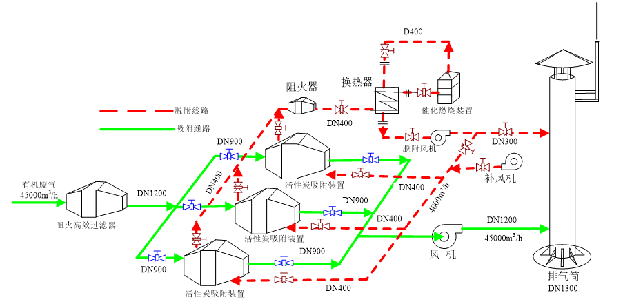 本装置根据吸附(效率高)和催化燃烧(节能)两个基本原理设计,采用双气路连续工作,一个催化燃烧室,两个或多个吸附床交替使用。先将有机废气用活性炭吸附,当快达到饱和时停止吸附,然后用热气流将有机物从活性炭上脱附下来使活性炭再生;脱附下来的有机物已被浓缩(浓度较原来提高十倍以上)并送往催化燃烧室催化燃烧成二氧化碳及水蒸气排出。当有机废气的浓度达到2000PPm以上时,有机废气在催化床可维持自燃,不用外加热。燃烧后的尾气一部分排入大气,大部分被送往吸附床,用于活性炭再生。这样可满足燃烧和吸附所需的热能,达到节能的目的。再生后活性炭的可进入下次吸附;在脱附时,净化操作可用另一个吸附床进行,既适合于连续操作,也适合于间断操作。