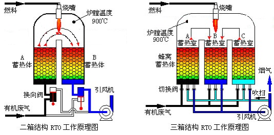 两床RTO主体结构由高温氧化室、两个陶瓷蓄热体和四个切换阀门组成。当有机废气进入蓄热体1后, 蓄热体1放热,有机废气被加热到800℃左右后在高温氧化室燃烧,燃烧后的高温洁净气体通过蓄热体2;蓄热体2吸热,高温气体则被蓄热体2冷却后,经过切换阀排放。经过一段时间,阀门切换,有机废气从蓄热体2进入,蓄热体2放热加热废气,废气被氧化燃烧后通过蓄热体1,蓄热体1吸热,高温气体被冷却后通过切换阀排放.这样周期性地切换,就可连续处理有机废气,同时无需或少量补充能量,达到节能效果。